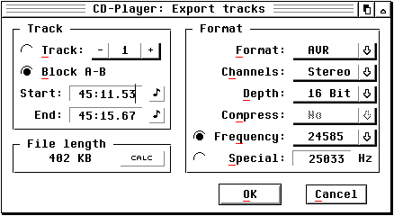 Included in the play-mode functions you'll find a play block operation. This is great for playing sections of your favourite tracks over and over again. Using the mark block keys you select the section of the track you wish to listen to, or dare I say, record [tut, tut, tut - FFF]. When the player starts to play the section in question left click on the 'A' button, at the end of the section you're marking as a block left click on the 'B' button. CD-Player will then keep the block details in memory for you to manipulate as you see fit. The block, once selected can be played back as we've already mentioned or, more usefully, using a built in export track function recorded to your hard drive (Your CD-ROM has to support this function, most up to date CD-ROM drives do).