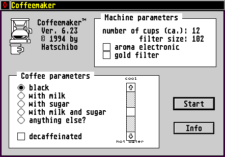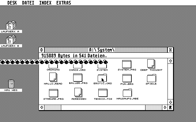 System was programmed in 1986/87 and some allusions like the ongoing dispute between Amiga and Atari users are typical for that time. If you double click on the trash icon two alert boxes will appear: 1) "Don't throw away your computer just because you don't like the operating system" 2) "Be happy that you don't have an Amiga!". One thing I have forgot to mention: The program is entirely in German. Author: unknown