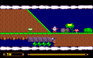 The main character will be instantly recognisable to most games players as Dizzy - the egg that can walk! He fits in well with the games overall presentation.The aim is to find all of the playing cards which are dotted around the play area. The picture cards are easy to find, but the others which are hidden behind doors are more difficult.
