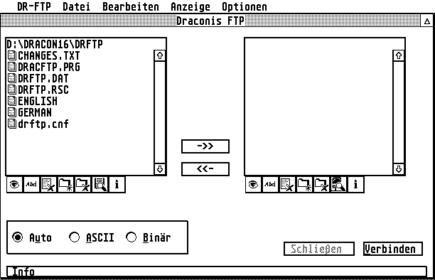 Der FTP-Client "Draconis FTP" hat mit seinem Doppelfenster große Ähnlichkeit mit dem FTP-Client "WS-FTP" für die Windows-Plattform. Dateinamen werden automatisch nach einstellbaren Regeln konvertiert, Binär- und ASCII-Dateien werden automatisch unterschieden. Bei "Draconis FTP" ist die intuitive Benutzerführung des "Draconis"-Internet-Paketes am weitesten fortgeschritten und auch eine weitgehende Tastaturbedienung möglich. Es ist wohl derzeit nach meinem Kenntnisstand der beste FTP-Client für das "AtariOS".