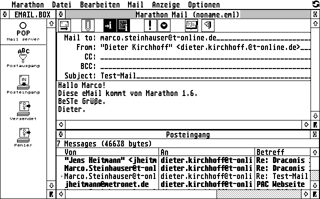 Im eMail-Client "Marathon" müßten m.E. möglichst bald folgende Funktionalitäten ergänzt werden, damit man mit ihm effizient arbeiten kann. Vor allem sind ein stabilerer Betrieb, eine intuitiv bedienbare Benutzeroberfläche mit allen Funktionen, ein besserer eMail-Texteditor, die Möglichkeit, mehrere Editor-Fenster gleichzeitig zur Textblockübernahme zwischen verschiedenen eMails zu öffnen sowie eine GDOS/NVDI-Druckfunktion ein Muß. Nützlich wären auch automatische Filter zur Sortierung eingegangener eMails.