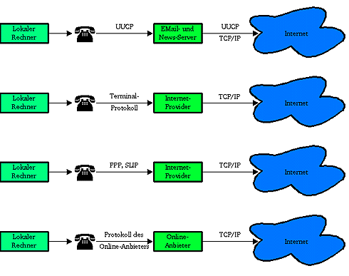 Zwischen diesen beiden Angeboten muß aber unterschieden werden, denn daß Internet-Dienste genutzt werden können, ist nicht gleichbedeutend mit der Einbindung des lokalen Rechners in das Internet. Ähnlich wie beim Terminalzugang besteht eine TCP/IP-Verbindung eventuell nur zum Rechner des Online-Anbieters. Die Kommunikation zum eigenen Rechner erfolgt mit einem anbieterabhängigen Terminal-Protokoll, das allerdings auch grafische Elemente übertragen kann. Im Gegensatz zu obigem Terminalzugang können hier also auch multimediale Dienste wie WWW genutzt werden. Die Nutzung der verschiedenen Internet-Dienste kann aber wesentlich eingeschränkt sein oder sie werden überhaupt nicht angeboten.