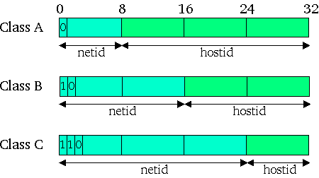 KlassengesellschaftWie groß die Anteile von netid und hostid an der IP-Adresse sind, hängt von der Netzklasse ab. Vorgesehen sind deren fünf; praktische Bedeutung haben die Klassen A, B und C. Unterschieden werden die verschiedenen Netzklassen an den Class Identifiers. So hat das erste Bit eines Class-A-Adresse den Wert 0, und die restlichen sieben Bit der ersten Gruppe werden der netid zugeordnet Bei einer Class-B-Adresse haben die beiden ersten Bit den Wert 10, die netid umfaßt die beiden ersten Gruppen. Eine Class-C-Adresse beginnt mit 110, die netid besteht aus den drei ersten Gruppen. Class-A-Adressen können Werte zwischen 1.0.0.0 und 126.255.255.255 annehmen (127 ist reserviert), es gibt also maximal 126 Class-A-Netze mit jeweils 224 Hosts. Class-B-Adressen liegen zwischen 128.0.0.0 und 191.255.255.255, maximal sind 214 Class-B-Netze mit jeweils 216 Hosts möglich. Schließlich umfassen Class-C-Adressen Werte zwischen 192.0.0.0 und 223.255.255.255. Insgesamt gibt es 221 Class-C-Netze mit jeweils 254 Hosts (0 ist zur Adressierung des Netzes reserviert und 255 spricht alle Rechner innerhalb eines Netzwerkes an).
