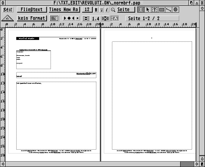 Mit zwei weiteren Returns kommt man in das nächste Textfeld. Hier wird in die erste Zeile rechtsbündig der Ort und ein Platzhalter für ein immer aktualisiertes Datum eingesetzt. In die nächste Zeile gehört linksbündig der Grund des Briefes (Betreff). Nach einem weiteren Return gelangt man ins Haupttextfenster, in dessen erste Zeile die Anrede gehört. Bild 10 zeigt die fertige Vorlage.