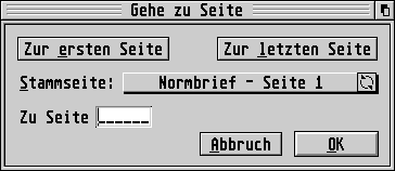 Die Einstellungen sind nun mit Button "Setzen" an das Dokument zu übergeben. Nun müssen noch die Einstellungen für die Stammseite "Normbrief- folgende" gemacht werden: Ränder des Textbereiches: Im Textbereich: Spaltensatz: Dann muß der Dialog mit OK-Button verlassen werden. Inzwischen sieht man in dem Dokumentenfenster drei Spalten, die aber für die Vorlage immer noch nicht die richtige Größe und Position haben. Deshalb wählt man mit ALTERNATE+P den Dialog "Gehe zu Seite" an. In diesem Dialog befindet sich ein PopUp-Button, mit dem man zu den Stammseiten gelangt (Bild 3).