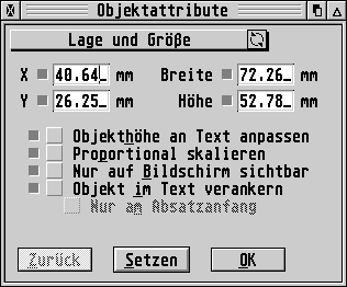 (Bild 4) Jetzt zieht man mit gedrückt gehaltener linker Maustaste einen beliebig großen Textrahmen auf und läßt die linke Maustaste wieder los. Der Mauszeiger wird als Textcursor dargestellt. Durch drücken der ESCAPE-Taste wird der Mauszeiger als Vierfachpfeil dargestellt. Während der Pfeil über dem Rahmen ist, die rechte Maustaste drücken, es erscheint ein PopUp-Menü, in dem der Eintrag "Lage und Größe..." anzuwählen ist. Es erscheint der Dialog "Objektattribute" (Bild 5).