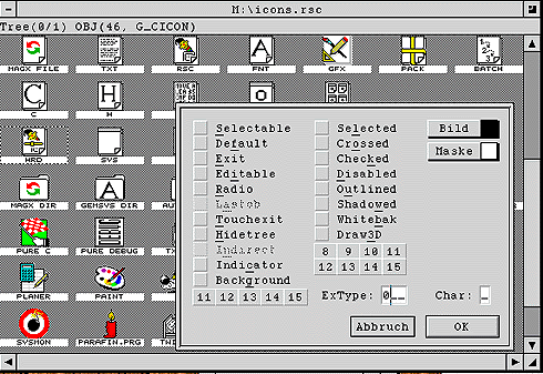 Ich möchte an dieser Stelle deutlich darauf hinweisen, daß ich im folgenden über eines meiner eigenen Programme referiere, sowas mache ich zwar äußerst ungern, aber für die Vollständigkeit des Artikels erschien mir dieses Vorgehen unumgänglich. Das Programm trägt den Namen RscView und ist hauptsächlich als Viewer für RSC-Files konzipiert, bietet jedoch zusätzlich die Möglichkeit, diverse Änderungen an geladenen RSC-Files vornehmen zu können. Das Programm kommt in Form eines etwa 26 KB großen Archives, nach dessen Entpacken der Hypertext in das entsprechende Verzeichnis des ST-Guide kopiert werden sollte, womit die Installation bereits beendet ist. Ebenso wie bei den vorgenannten Programmen erweist es sich als praktisch, es im Desktop als Anwendung für "*.rsc" anzumelden. RscView ist als Viewer eingesetzt Freeware, verlangt jedoch einen Schlüssel, wenn veränderte Resource-Files abgespeichert werden sollen.