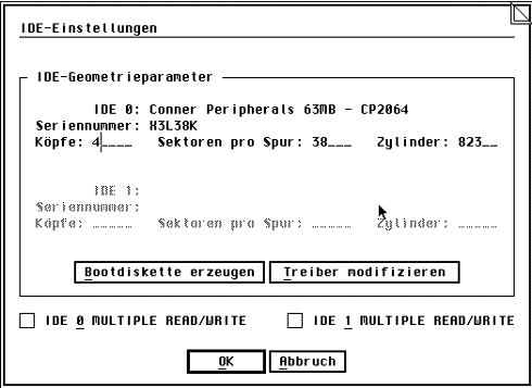 Wenn Sie diese Schritte erfolgreich abgeschlossen haben, können sie unter dem Menüpunkt 'Treiber modifizieren' den HDDriver, wie im Handbuch beschrieben, erneut auf der Platte installieren. Beachten Sie bitte, daß Sie danach am besten Ihr System kurz abschalten, also einen Kaltstart machen, damit der Rechner alle neu eingerichteten Devices korrekt finden kann. Findet sich die soeben bearbeitete IDE-Platte nach dem Booten weiterhin nicht, können Sie versuchen, ob sich diese Platte über eine eine sog. Bootdiskette ansprechen läßt. Eine entsprechende Bootdiskette wird unter dem Menüpunkt 'IDE-Parameter' erzeugt, in dem man dort die entsprechende Option benutzt. Eine so erstellte Bootdiskette sollte sich dann beim Boot-Vorgang in Laufwerk A: Ihres Ataris befinden. Persönlich bevorzuge ich an allen meinen Ataris immer noch SCSI-Geräte, auch wenn speziell am Falcon mit IDE-Platten idR bessere Transfergeschwindigkeiten erreicht werden können.