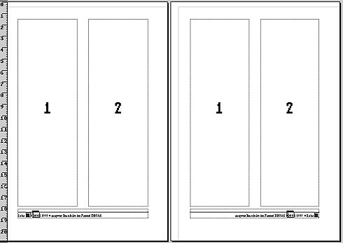 Wichtig hierbei ist jeweils die Einstellung "Rechts:", da sie dem unteren nicht bedruckbaren Druckerrand entsprechen muß, um alles auf das Papier zu bekommen. Den Rest der Stammseiten - auf das Erstellen von Stammseiten wurde ausführlich im ersten Teil eingegangen - kann man beliebig gestalten, allerdings sollte man nicht mehr als zwei Textspalten verwenden. Im Bild 4 ist ein Beispiel für den Aufbau von Stammseiten zu sehen.