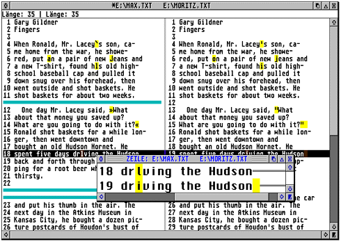 JOHANNES: "Tausend Möglichkeiten, jaja, blitzweiße Wäsche, und bügelt soll dieses E-gal-e wohl auch noch, oder wie sieht das konkret aus?" Nehmen wir an, wir haben zwei Dateien MAX.TXT und MORITZ.TXT, die miteinander verglichen werden sollen. Wir laden sie in égale, und wenn die Dateien übereinstimmen, meldet égale dies gleich in einer Dialogbox. Wenn nicht, müssen wir uns die Unterschiede etwas genauer ansehen. égale stellt die zwei Dateien in einem Fenster dar, das durch einen schmalen grauen Balken in zwei Hälften geteilt wird. Links zeigt égale MAX, rechts ist MORITZ zu sehen. Textdateien (sowie Quelltexte) werden Zeile für Zeile ausgegeben und verglichen, Binärdateien erscheinen Zeichen für Zeichen. Ein Balkencursor ermöglicht die Navigation in der Datei. Zeilennummern werden auf Wunsch ausgegeben.