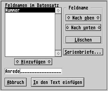 Hat man zuvor eingestellt, daß sich die Namen der Felder in der ersten Zeile der Datei befinden, so sollten alle Namen in der Liste aufgeführt sein; man kann den entsprechenden Namen des Serienbrieffeldes auswählen und mit RETURN oder dem Button "In den Text einfügen" das Feld in das Dokument übernehmen. So geht man nun für jedes Feld vor. Sollten sich wider Erwartens keine oder falsche Namen in der Liste befinden, so wurde ein falsches Format gewählt und man muß dieses korrigieren. Zu dem Dialog gelangt man jetzt auch über den Button "Serienbriefe...". Hat man aber eine Datei, in der sich die Namen nicht befinden, so ist die Liste beim Öffnen des Dialoges leer und man muß erst allen Feldern in der Datei einen Namen geben (Bild 4).