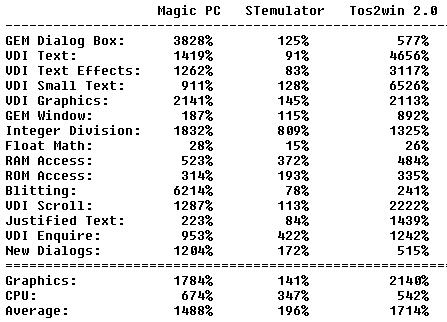 Sporadische TestsBei der Prüfung der Lauffähigkeit verschiedener Programme fällt auf, daß bekannte Fehler der letzten TOS2WIN-Version ebenso bei ST-Emulator auftreten. Dazu zählen u.a. Farbdarstellungsprobleme im Calamus SL oder das Nichterkennen der Registrierung beim Maustausch-Programm CAT. Eine Vielzahl von Programmen lief allerdings tadellos, die Probleme treten eher in (für TOS-Systeme) ungewöhnlichen Color-Umgebungen auf (Softwareprobleme?). Auf einem AMDK6-200 läuft ST-Emualtor in ansprechender Geschwindigkeit, dabei ist im Vergleich zu MagicPC subjektiv eine forcierte Ladegeschwindigkeit feststellbar, TOS2WIN 2.0 bleibt hier aber vorn. Das subjektive Gefühl konnte von einigen Benchmarks-Tests, zumindest was die Arbeitsgeschwindigkeit angeht, nicht unbedingt bestätigt werden. Folgende Tabelle soll nicht unveröffentlicht bleiben: