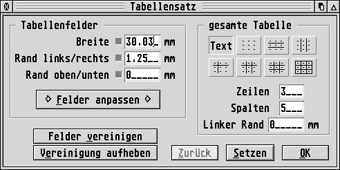 die Zeilen- und Spaltenzahl, der Abstand vom linken Rand des Textbereiches