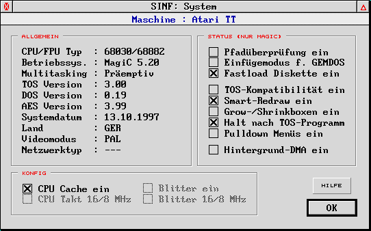 Betriebssystem, die Versionsnummern vom TOS, DOS und AES aus. Für MagiC-Benutzer