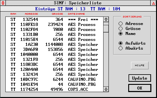 In diesem Fenster werden die kompletten Speicherlisten im ST- und TT-RAM