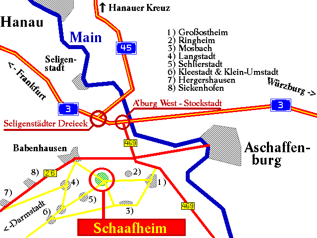 Ab hier folgt eine lokale Anfahrtsbeschreibung nach Schaafheim aus den Richtungen BAB A3