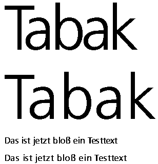 Das obere "Tabak" ist ohne Kerningpaare abgesetzt, während das untere mit Kerningpaaren gesetzt ist. Und um extreme Löcher zu vermeiden werden solche ungünstigen Buchstabenkombinationen (wie hier "Ta")in Ausnahmelisten gefährt. Normalerweise sind ausreichend solcher Kerningpaare in Qualitätschrifen (egal, ob im PostScript-Type1(PFB/AFM)-, TrueType(TTF)-, Speedo(SPD)-, Calamus(CFN)- oder in einem anderen Format) zu finden, bei Public-Domain- oder Billig-Schriften sollte man sich dieser aber nicht sicher sein. Deswegen