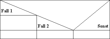 Da mit der "Alternative" die Möglichkeiten sehr eingeschränkt sind, gibt es die Fallabfrage. In ihr sind beliebig viele parallel verlaufende Blöcke, bzw. Sequenzen möglich. In dem großen Dreieck steht wiederum die Frage und in den kleinen Dreiecken links die möglichen Antworten (Fälle)