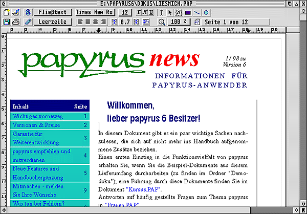Es ist gerade mal ein halbes Jahr her, da erblickte die Version 5.5 der Textverarbeitung papyrus auf der Atari-Messe in Neuss den Bildschirm., Aufgrund der Ankündigung, die (fast) jeder papyrus-User bekommen hatte, war die Überraschung dann nicht mehr sehr groß, als die Berliner "Software-Schmiede" ROM-Logicware auf der diesjährigen Frühjahrsmesse die Version 6 von papyrus präsentierte. Es wurden nicht nur kleine seltene Bugs entfernt, sondern neben dem neuen Dokumentenformat HTML, auch eine Menge neue Features eingebaut.