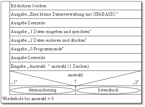 Wie aus dem Struktogramm (Abb.1) zu erkennen ist, soll das Hauptprogramm aus einem Auswahlmenü und zwei Unterprogrammteilen bestehen. Das erste Unterprogramm "Datensicherung" führt Eingaben verschiedener Daten durch, ruft dann den Fileselector auf und speichert die Daten unter dem gewählten Namen in einer Datei.