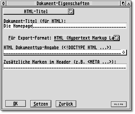 Im Dialog "Dokument-Eigenschaften - HTML-Titel" (Abb.10), zu dem man über den Menüeintrag "HTML-Titel..." im Menütitel "Dokument" gelangt, können Hinweise zu dem Dokument eingegeben werden. In jedem Fall eingegeben werden sollte der Dokument-Titel, der später im