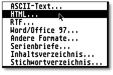 Nachdem nun alle zum Export wichtigen Einstellungen getätigt worden sind, kann das Dokument in eine HTML-Datei exportiert werden. Hierzu wählt man unter dem Menütitel "Datei" den Menüeintrag "Erzeugen" und in dem dann erscheinenden Popup-Menü (Abb.13) den Eintrag "HTML..." an.